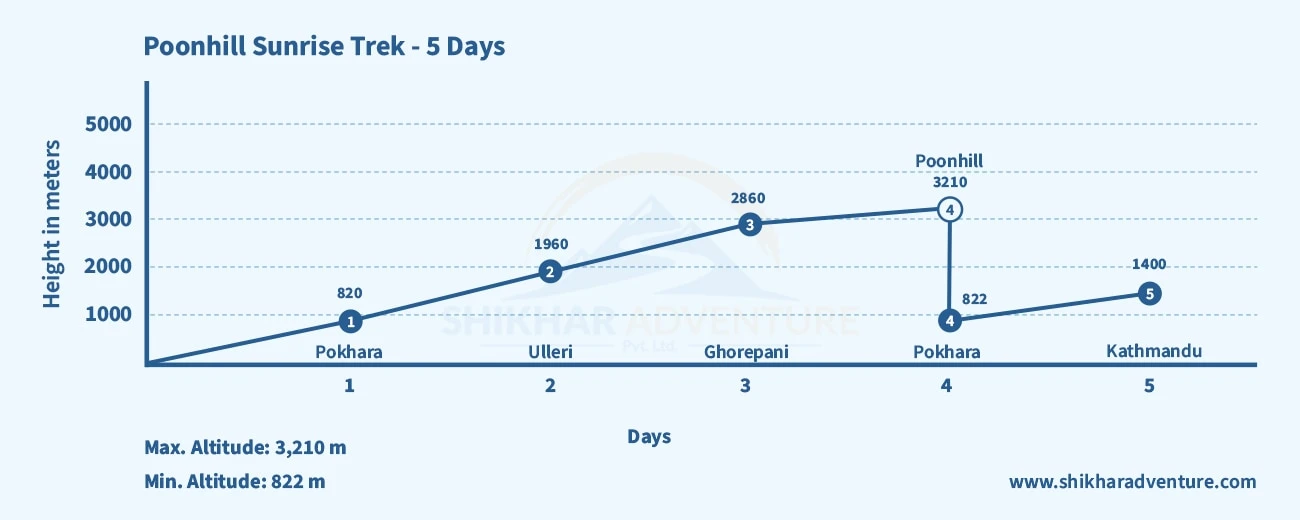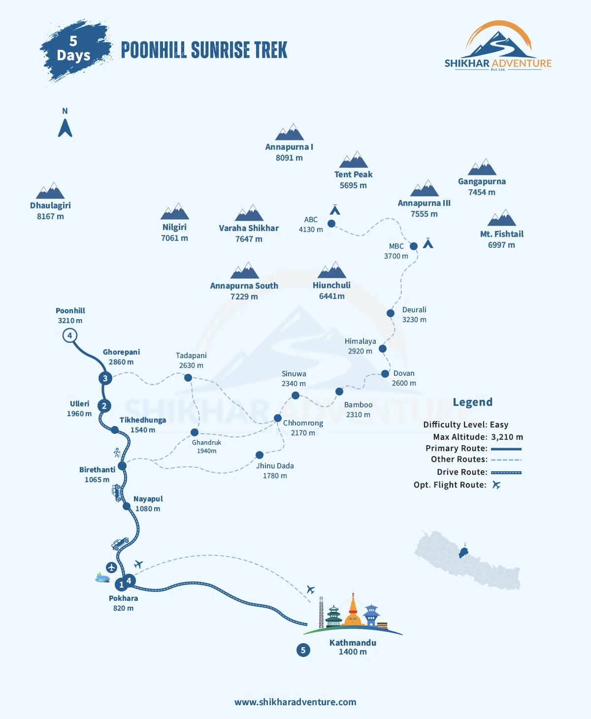 Poonhill Trek from Kathmandu is one of the most breathtaking 5-day trekking journey from Kathmandu, suiting all kinds of trekkers. This trek has been one of the most famous among other trekking routes to witness the natural beauty and cultural richness of Nepal for its panoramic sunrise view over the ranges of Annapurna and Dhaulagiri mountains. Starting in the bustling city of Kathmandu, you’ll journey through lush forests, charming villages, and terraced farmlands before reaching the iconic viewpoint at Poonhill (3,210 meters). The trek is ideal for travelers seeking a short but rewarding Himalayan experience, with moderate trekking routes and stunning scenery at every turn.